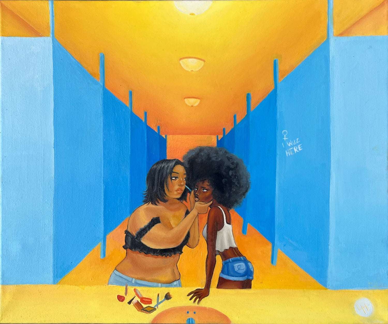 This is the first of the Women’s Bathroom series that I am depicting. This represents the first time I used highlighter makeup as it was applied for me. Making it the perfect memory to begin this series. A quiet and sacred moment that I captured to represent the space.